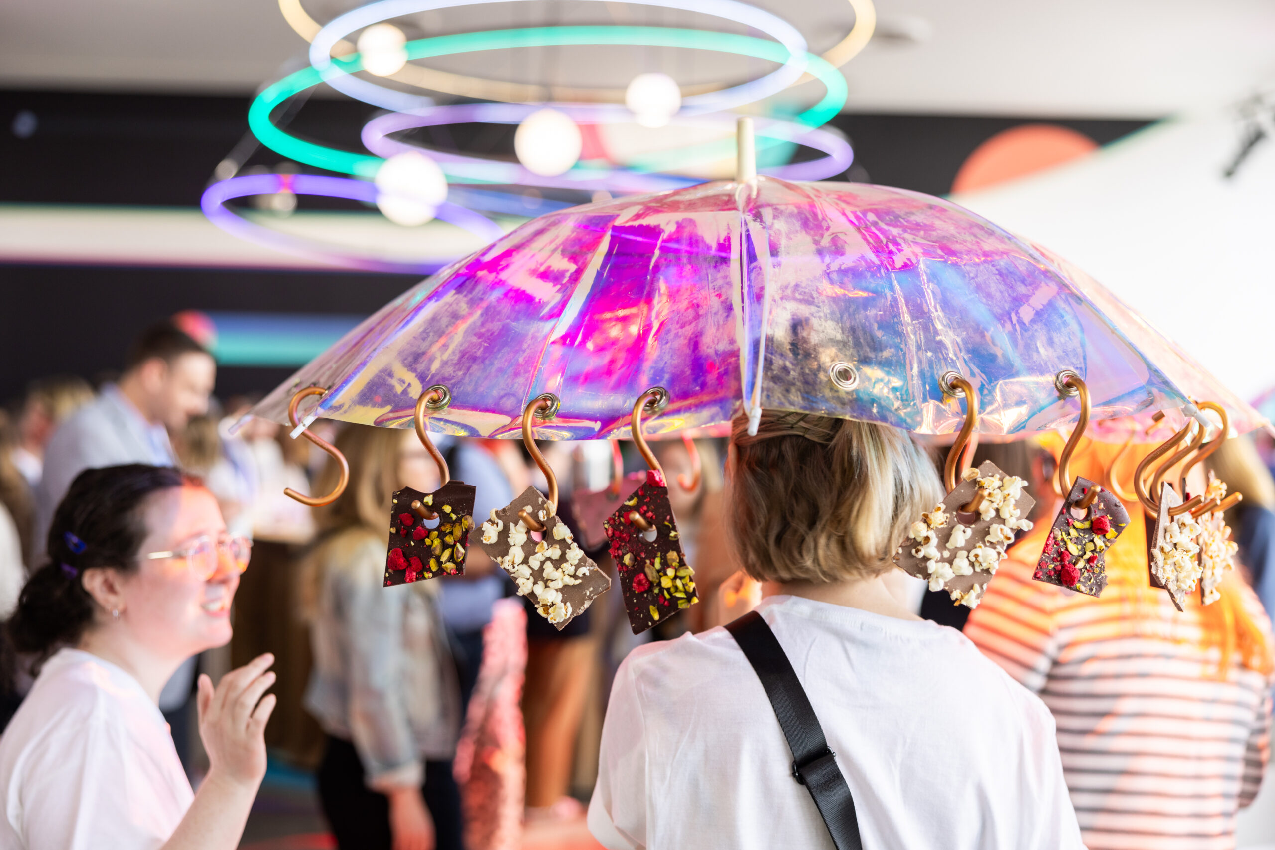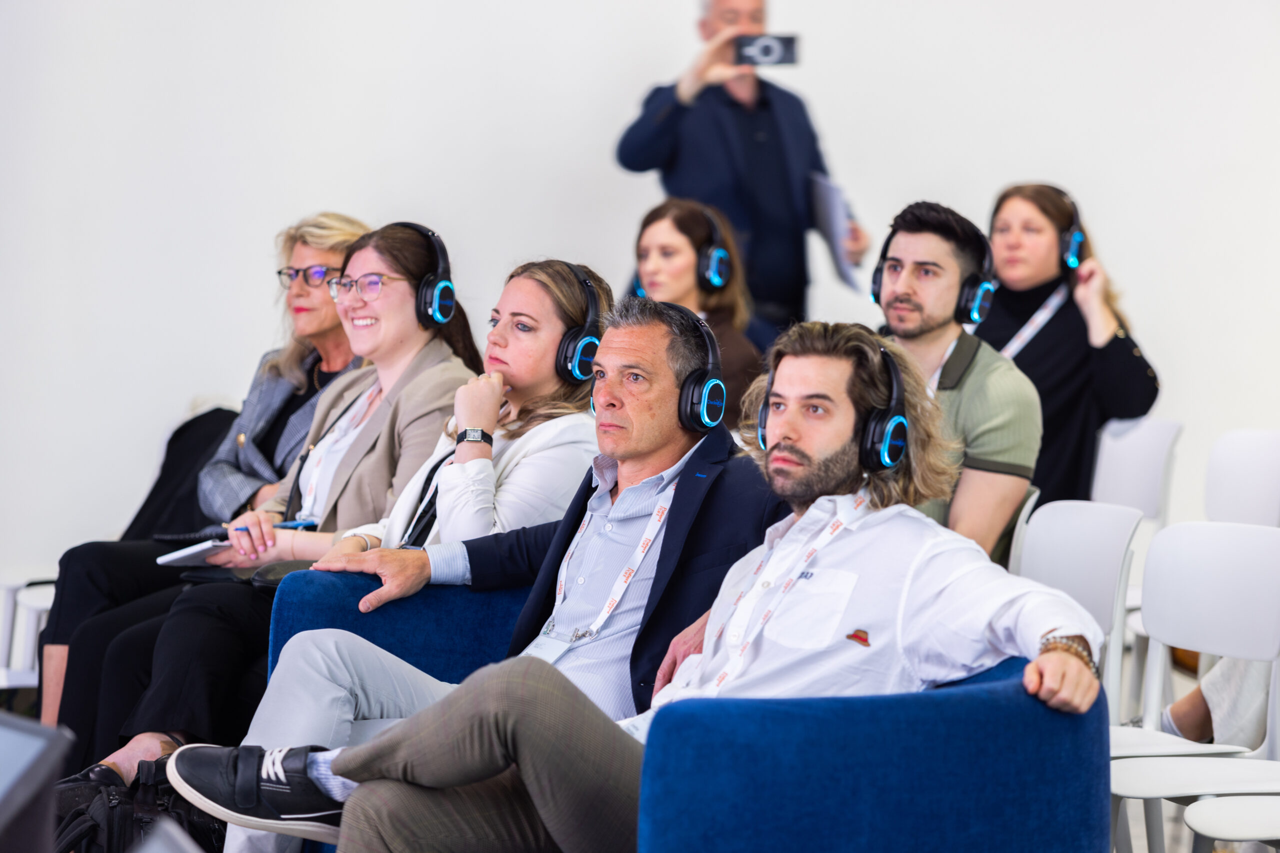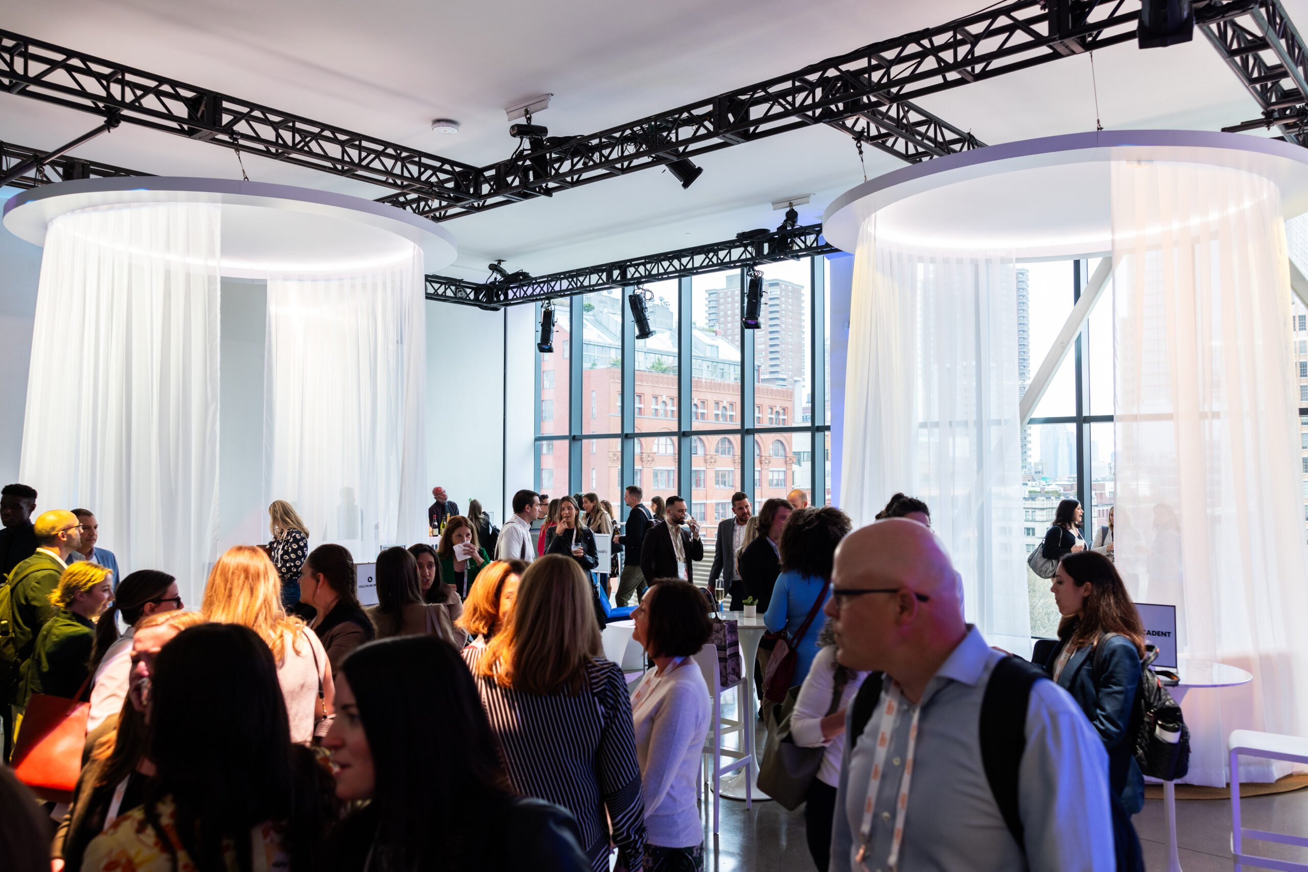 Our staging and design in the primary event space featured an oval LED screen and dynamic lighting, with suspended mirrored chrome balls reflecting the energy of the room. A circular bar with an abstract lighting installation hanging above established a vibrant networking hub, and the “ethereal pods” created for the adjacent studio space on the venue floor provided a more intimate engagement space for vendor sponsors. The main stage programming featured star-studded panels with influential speakers like Brooke Shields, Gabrielle Union-Wade, Sasha Colby (Season 15 winner of RuPaul’s Drag Race), Glamour Editor-in-Chief Samantha Barry, and Dr. Shieva Ghofrany, who shared insights on health advocacy and industry advancements. To enhance the Masterclass experience, wireless silent disco headphones were provided, allowing attendees to tune into sessions without distractions from the lively networking areas. This innovative solution ensured clear, focused learning while maintaining the dynamic atmosphere of the event. As a result of our close collaboration with the PHM team, we seamlessly executed the design and technical elements, delivering an environment that fostered connection, innovation, and inspiration.